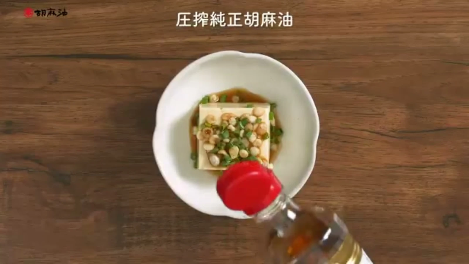 お皿に絹ごし豆腐を盛り、天かす、青ねぎ、めんつゆをのせ、圧搾純正をまわしかける。