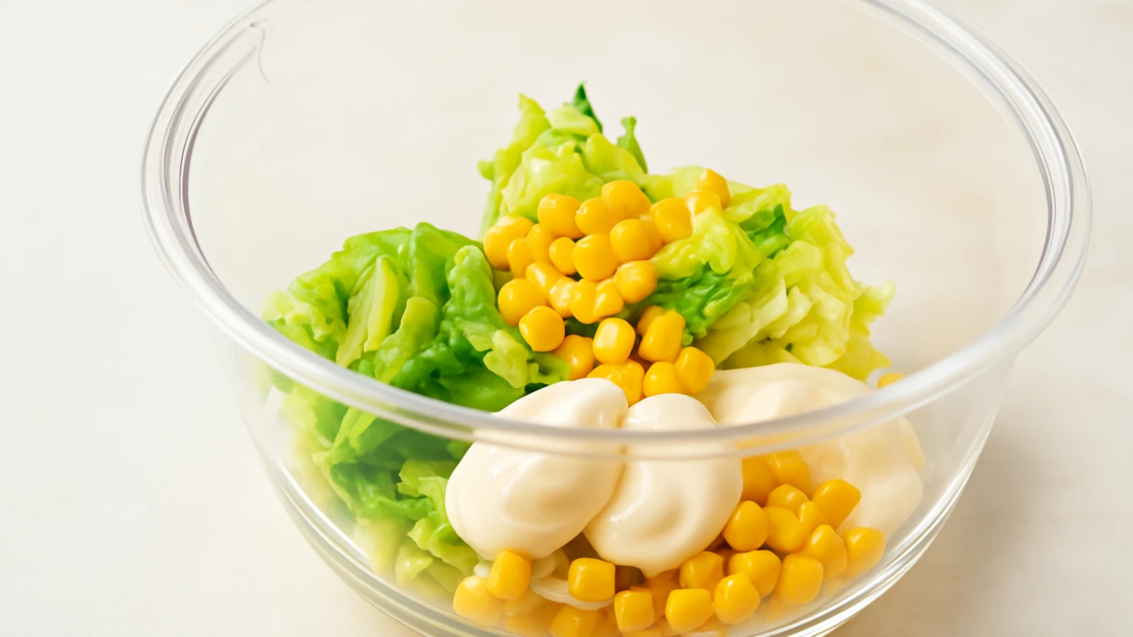 春キャベツにハムとコーンを合わせて、調味料を入れて和える。
